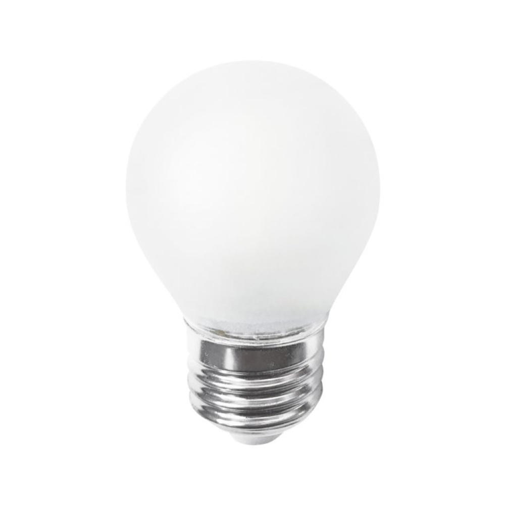 Descubre el Bombillo LED Vintage Mini Globo Frost 4.5W Regulable Radon I con luz cálida de 2700K. Ideal para luminarias E27, ofrece 25,000 horas de vida útil y un brillo de 420 lm