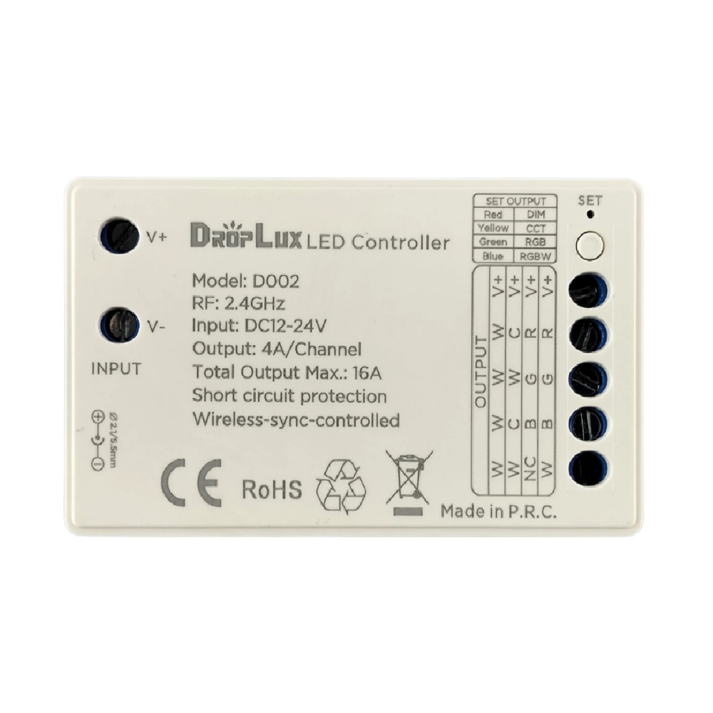 Descubre el Controlador RGB – CCT 4 en 1 16 Amp D002 en LumenConcept.com. Perfecto para tiras LED, ofrece color ajustable e instalación fácil