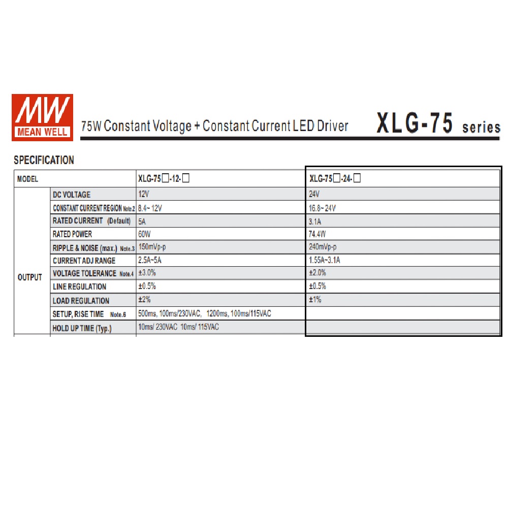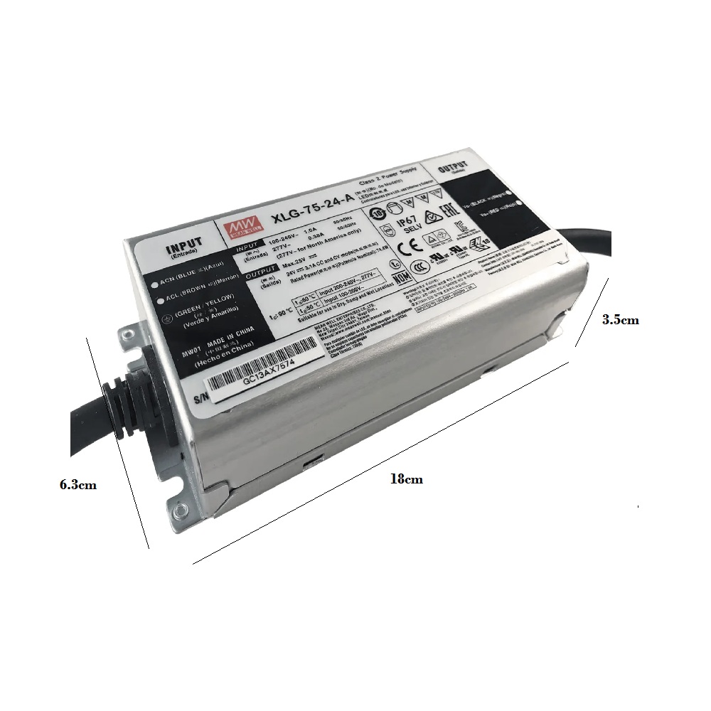 Fuente para cinta Led IP65 75W 24V (Exterior). Ref. XLG-75-24-A Meanwell. Transforma la corriente de entre 84~240V AC a una corriente de 24V DC. Producto ideal para alimentación de cintas led y tiras led de 24V. Esta fuente cuenta con protección a la humedad.