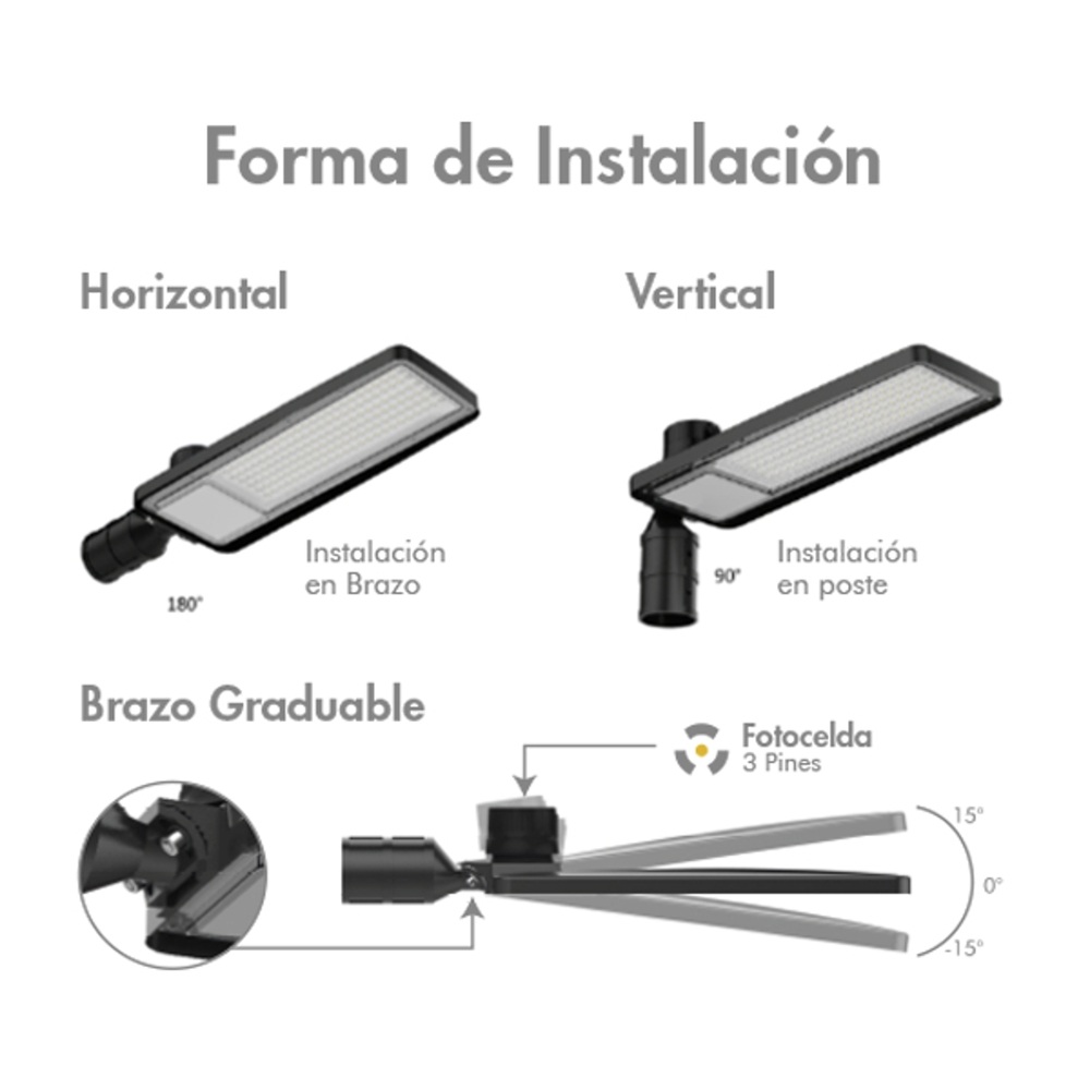 • Equipada con fotocelda de 3 pines, permite un control automático de encendido y apagado según la luz ambiental, favoreciendo el ahorro energético y reduciendo la intervención manual.