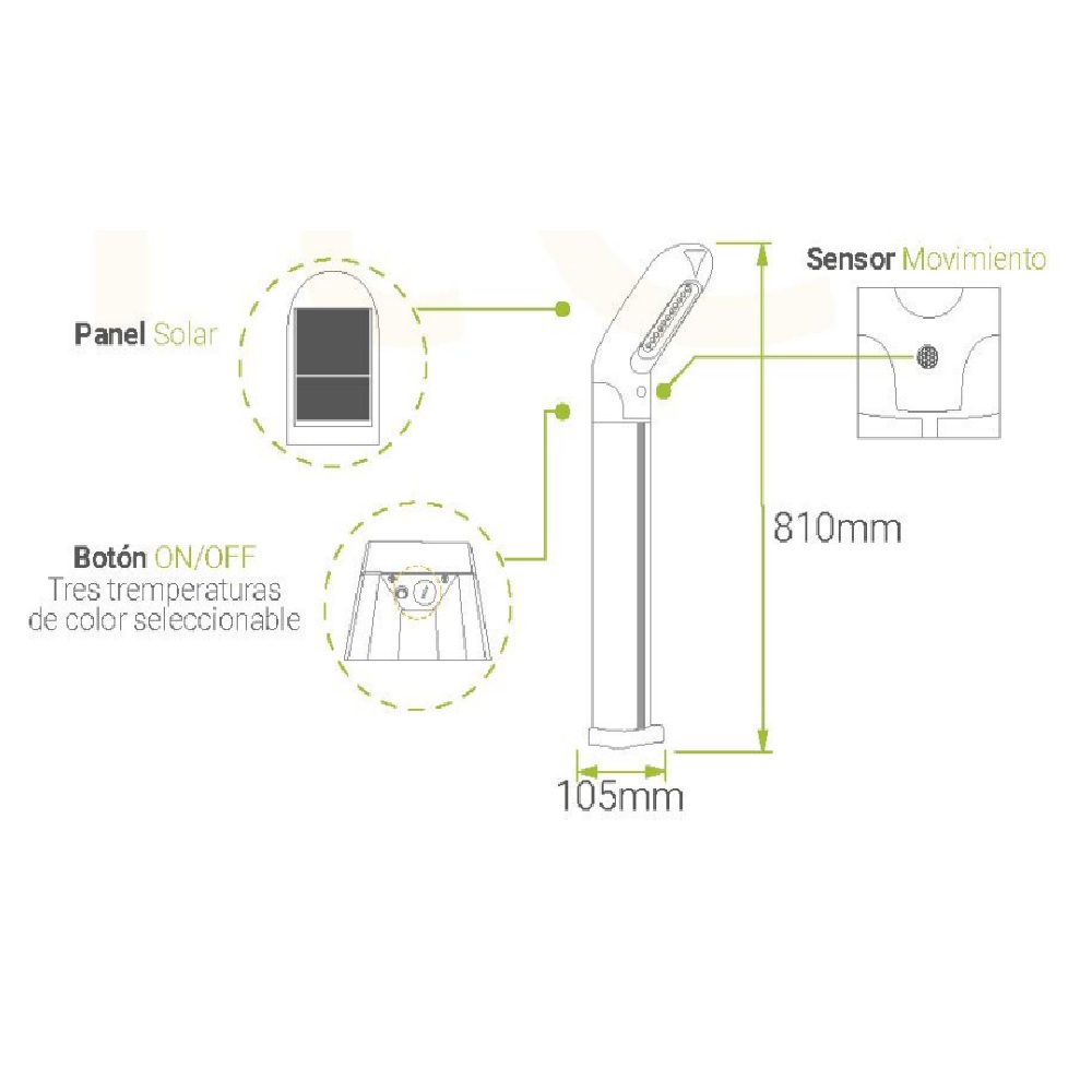 Ilumina tus espacios exteriores con el Poste Solar Led Integrado de 81 cm y 5W en Blanco Dinámico. Ideal para parques y senderos, con tecnología eficiente y diseño moderno
